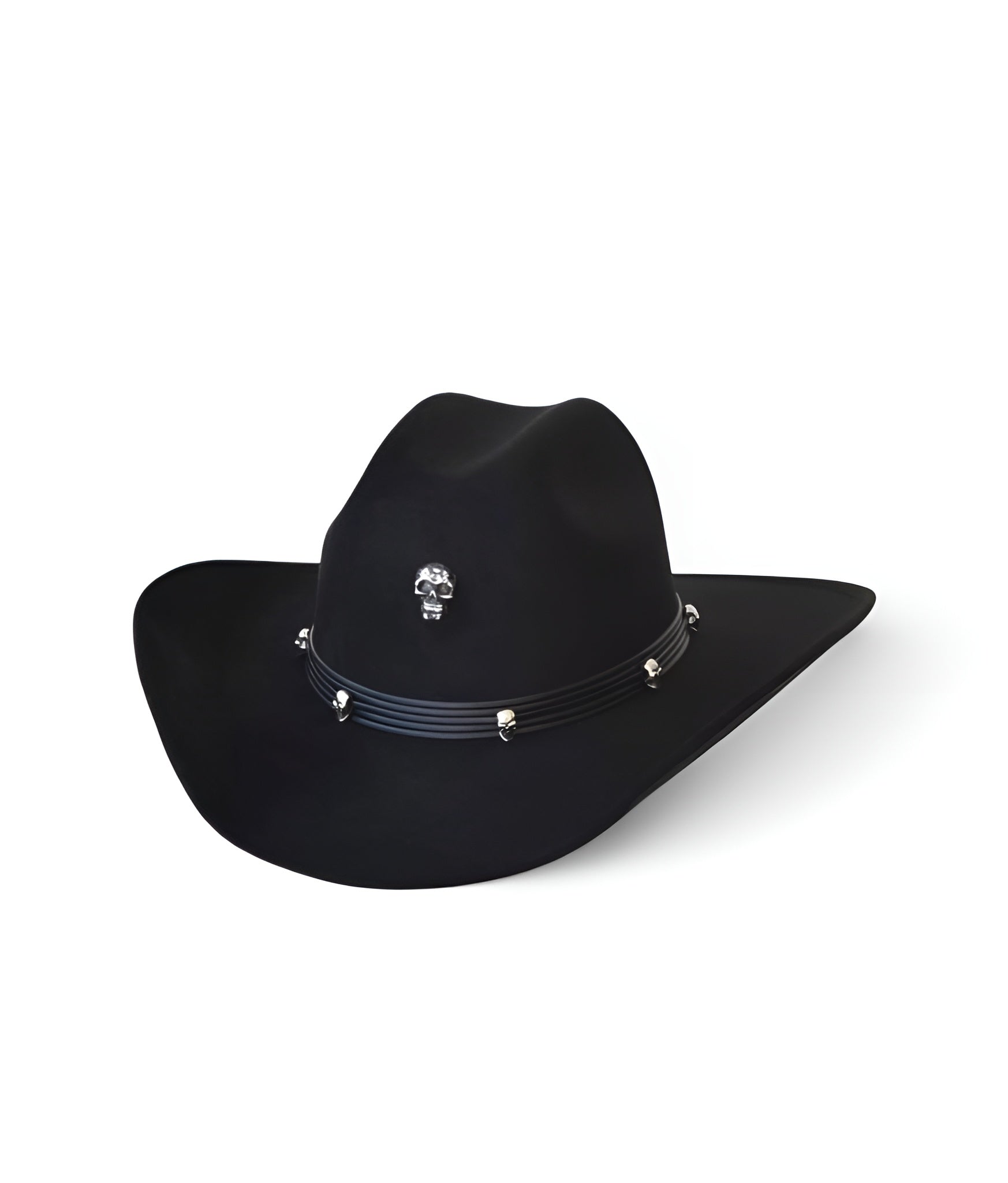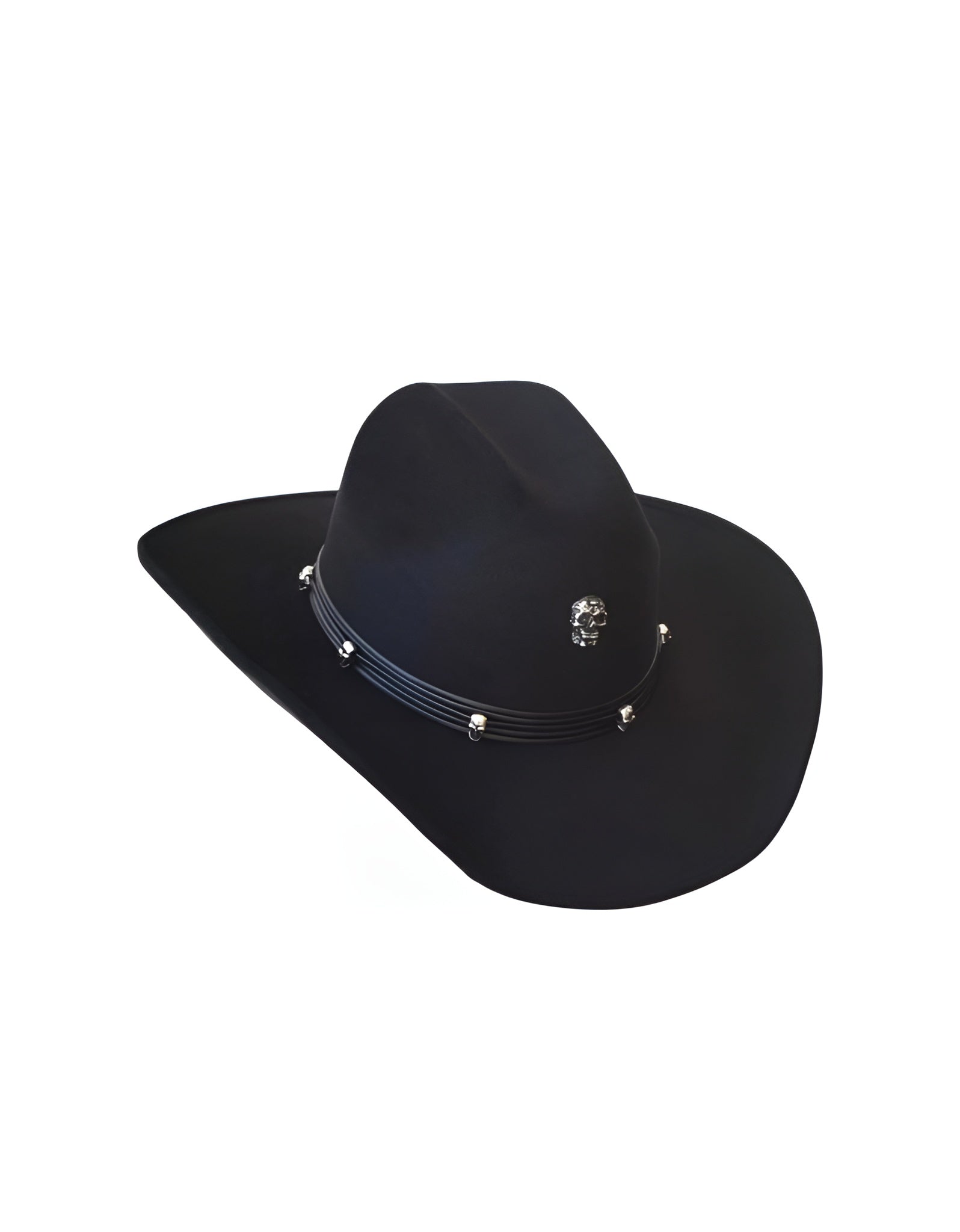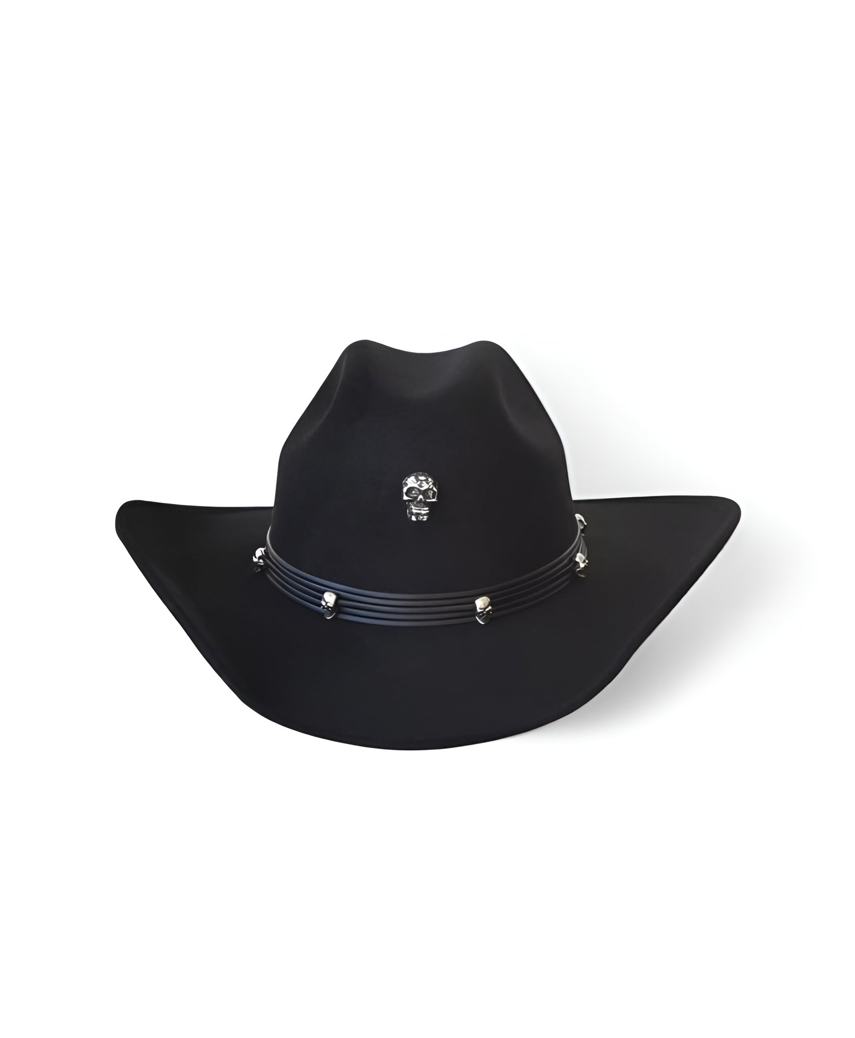 Oscuro, enigmático, directo del inframundo. Este sombrero de gamuza negra porta una calavera central como estandarte y un séquito de cráneos metálicos que lo escoltan. Catacumba no acompaña, lidera.
