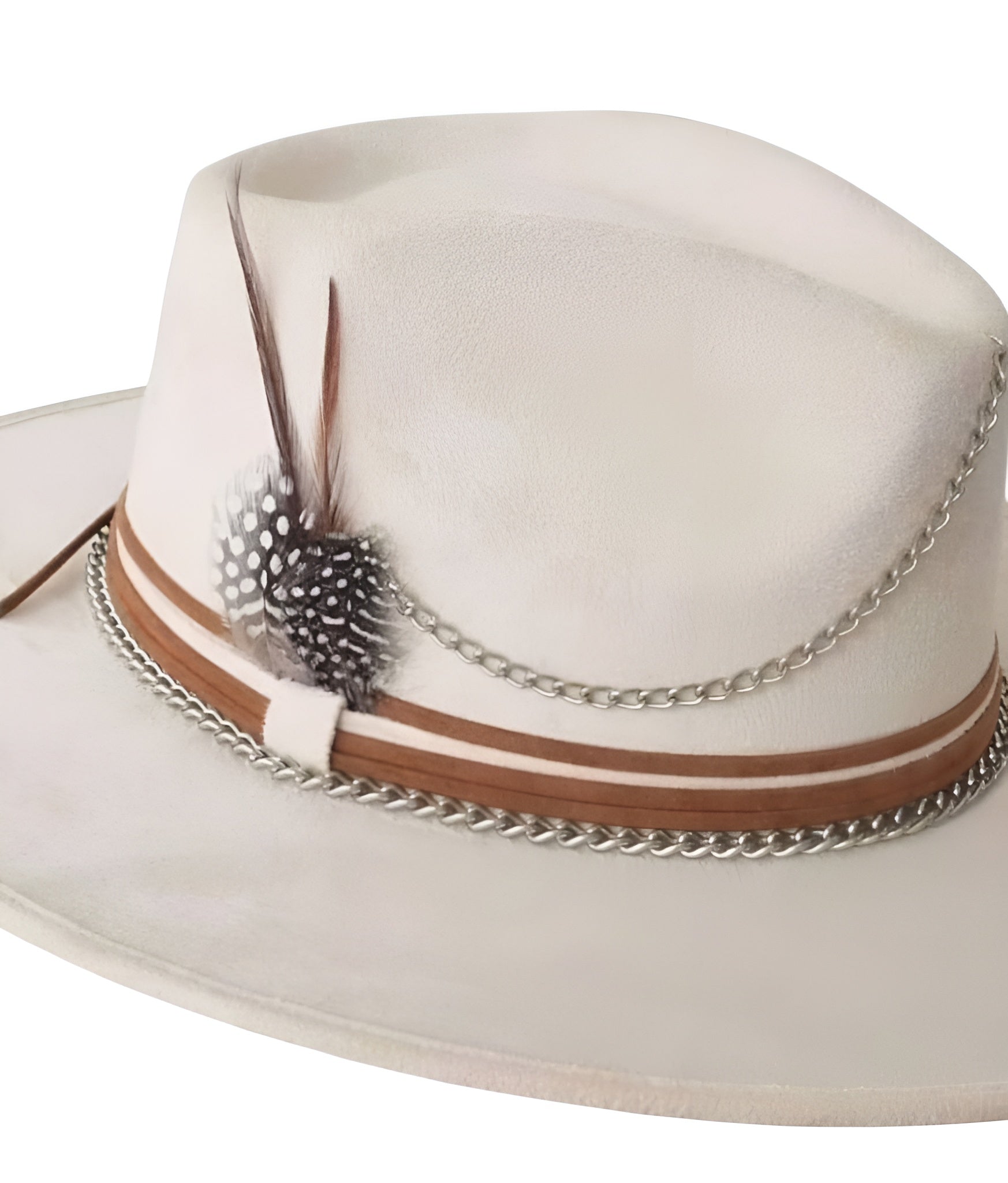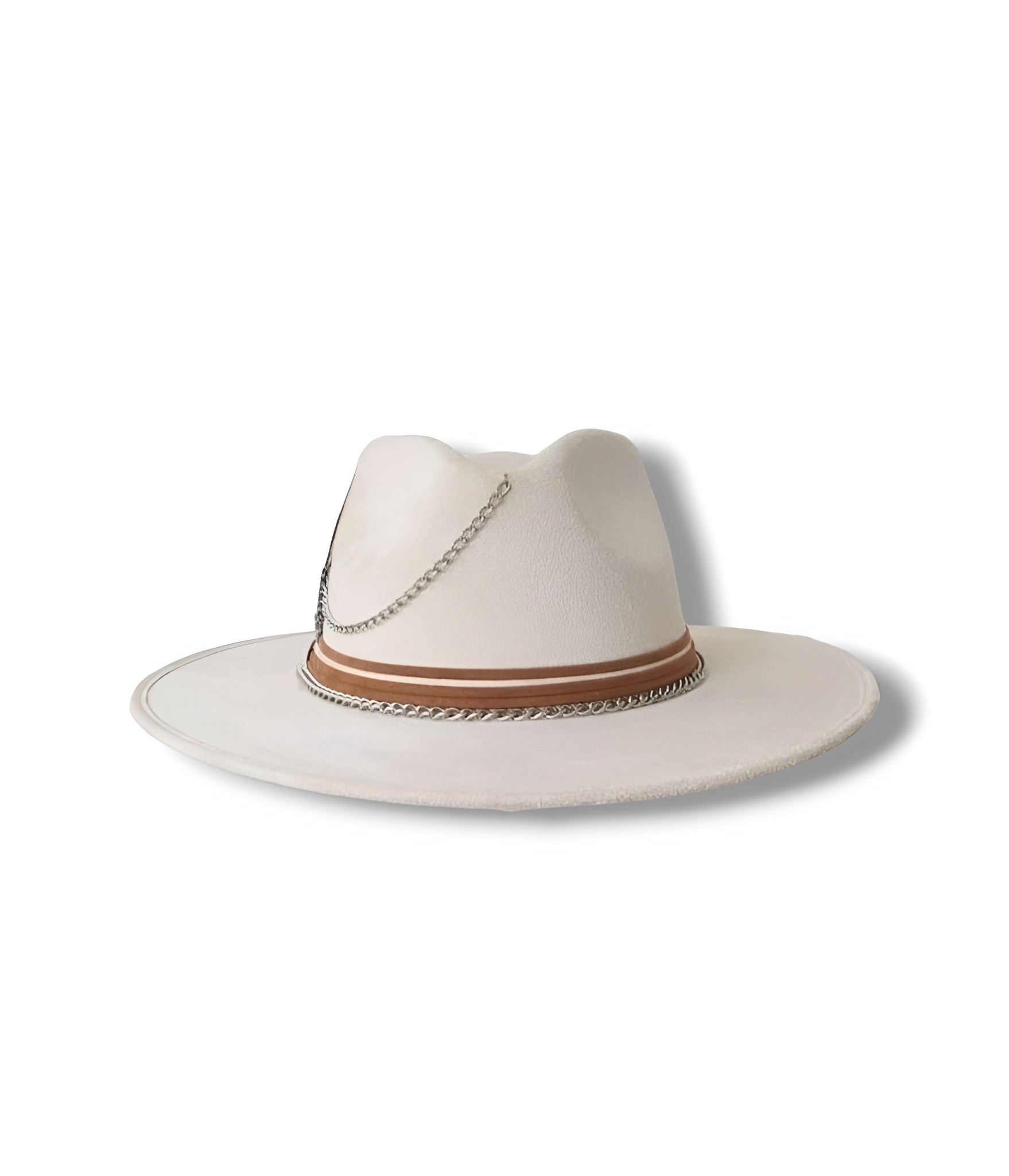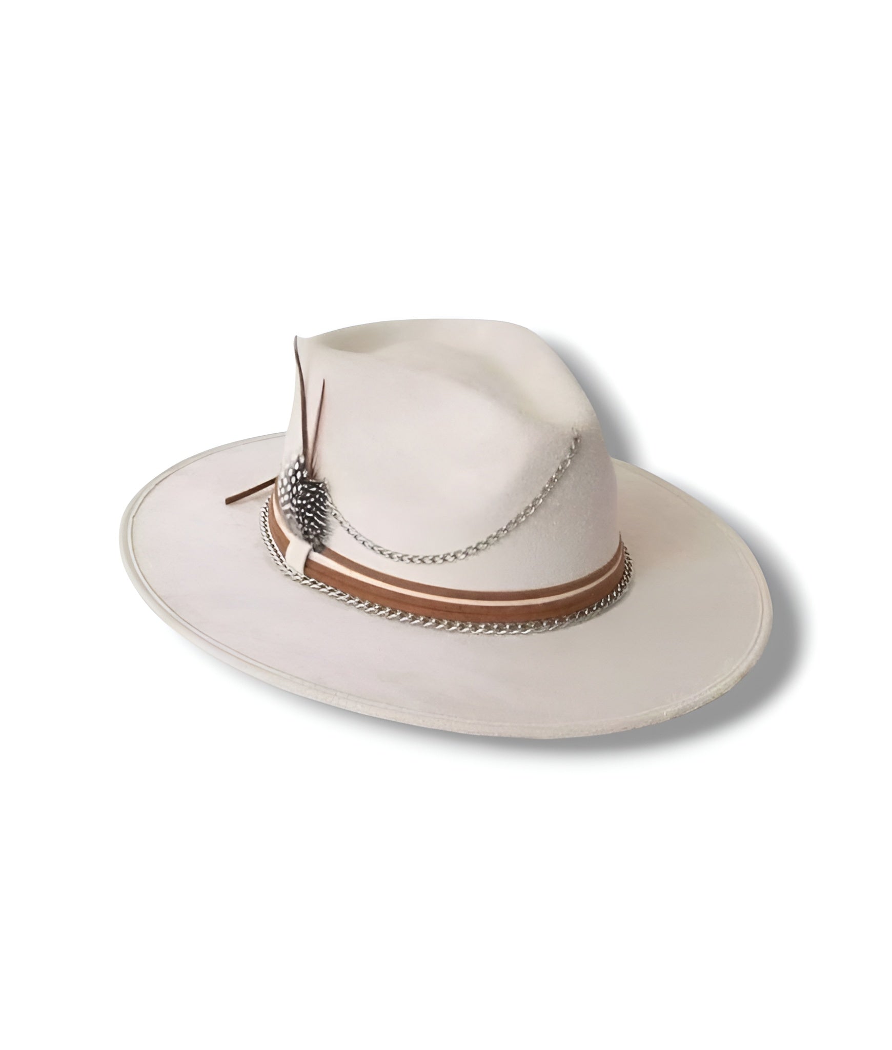 Delicadeza y fuerza se encuentran en este sombrero de gamuza color ivory o cacky. Su diseño combina la suavidad de los tonos neutros con acentos metálicos y detalles que evocan una elegancia serena pero decidida. Cecilia es para quienes saben que la sutileza también tiene poder.