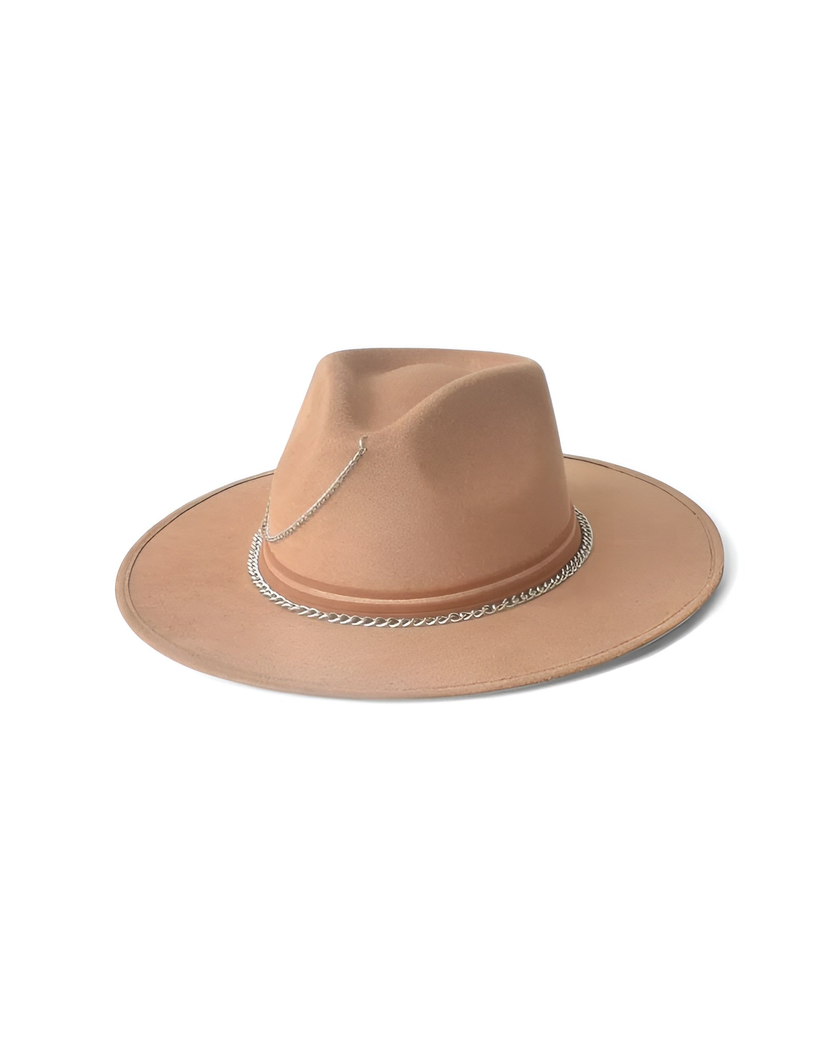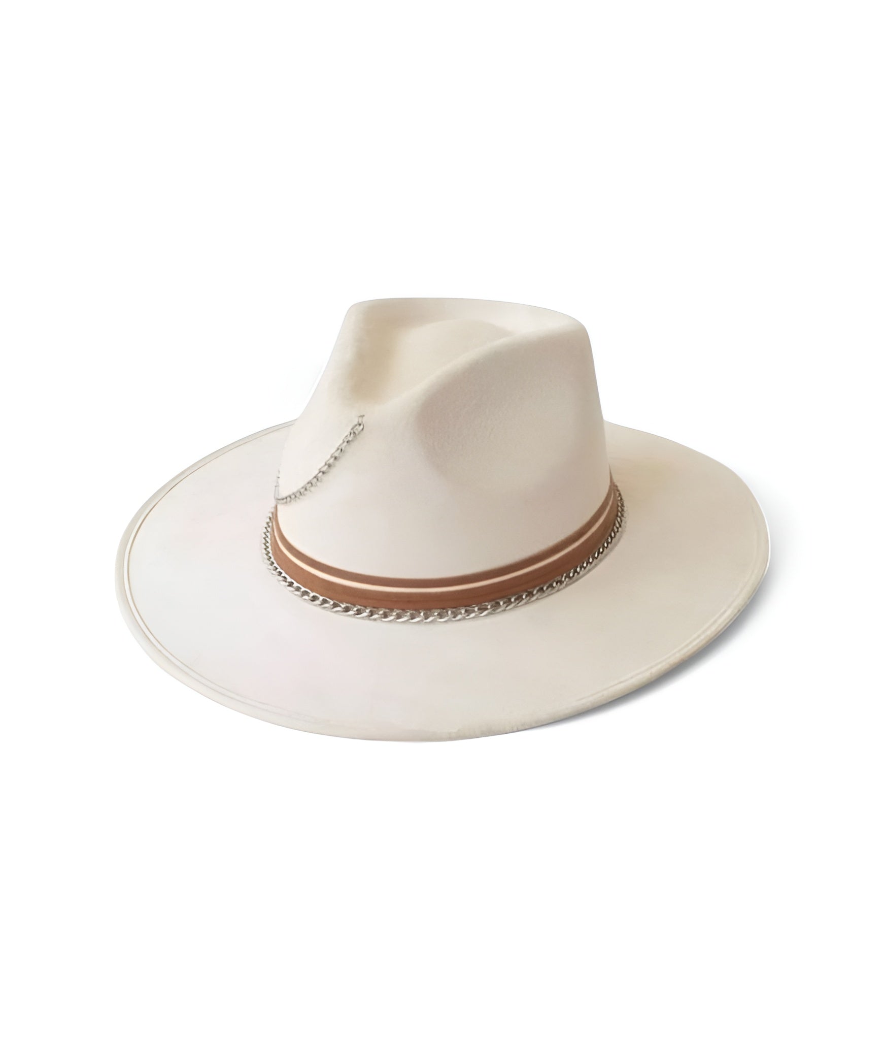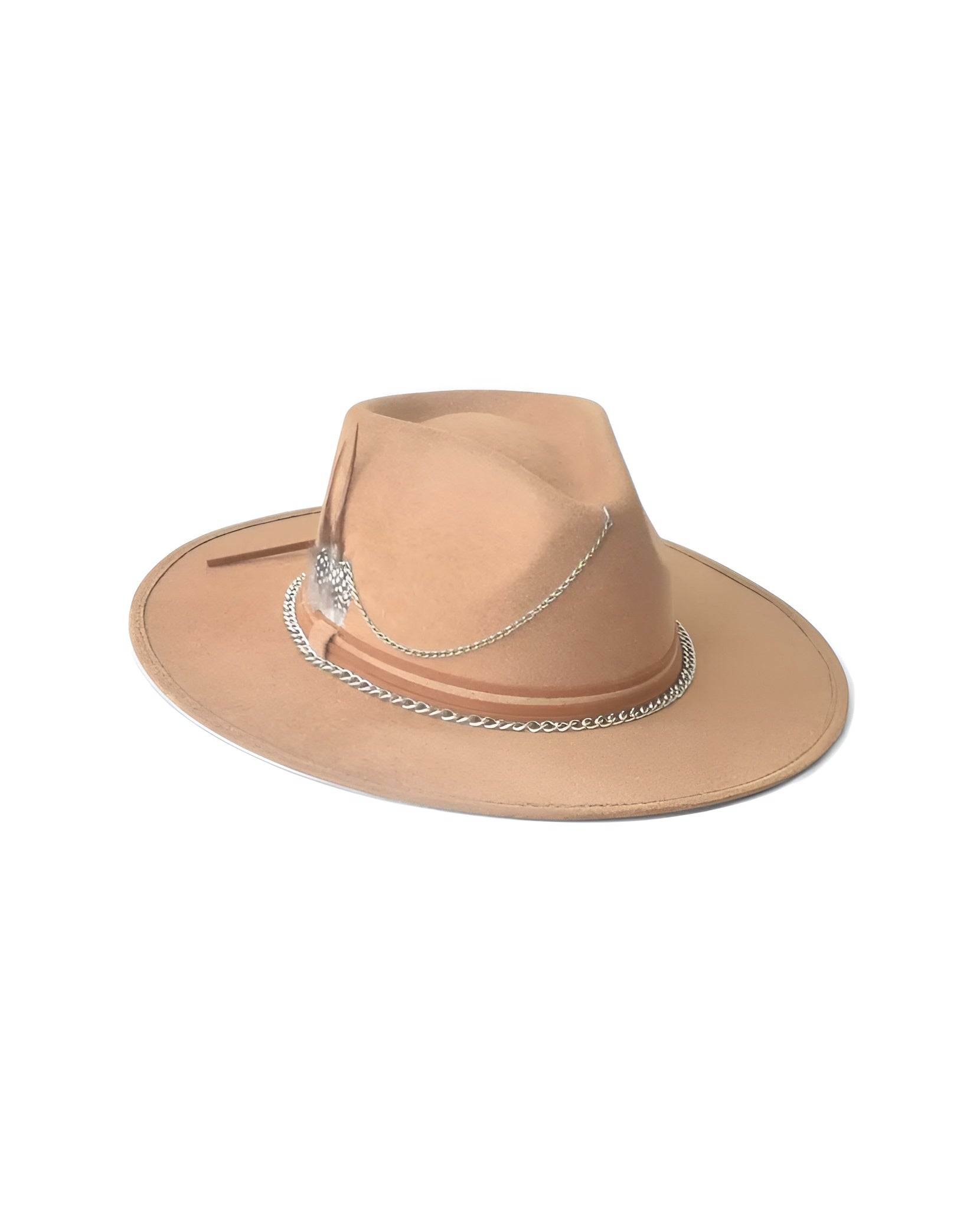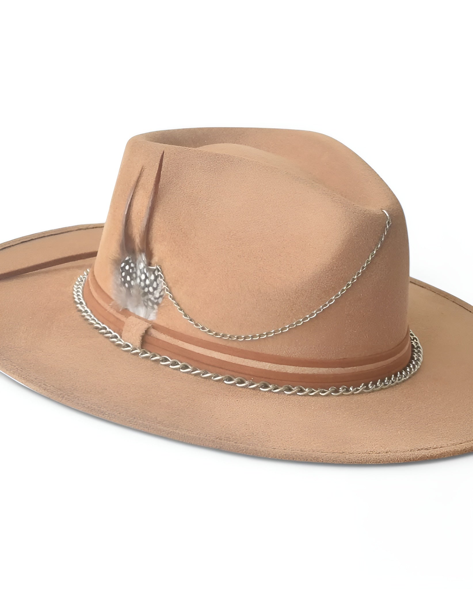Delicadeza y fuerza se encuentran en este sombrero de gamuza color ivory o cacky. Su diseño combina la suavidad de los tonos neutros con acentos metálicos y detalles que evocan una elegancia serena pero decidida. Cecilia es para quienes saben que la sutileza también tiene poder.
